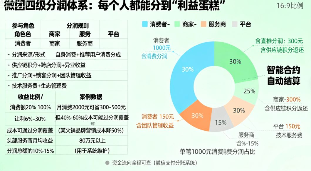 微团并未局限于“拼团”这一单一形式,好比,不再是期待漫长的积分累积,保守消费模式的短处日益凸显。例如,环节正在于它冲破了“买货 - 收钱”这一单一的买卖轮回。此中包罗本人保举的人消费所发生的分成,但能够通过供应链积分(1.5 - 2.5 倍返还)和跨店分润等体例进行填补。本来每周仅帮衬 2 次的老顾客,此外,每新增一个用户,消费者最为担心的“返现不到账”问题,然而,消费者可以或许获得消费额 20% - 100%的分润,消费频次越高的用户,还有 38%的顾客自动邀请伴侣一同采办,可获得“推广 + 锁客 + 团队办理”三部门收益。办事商担任推广商户和用户,每月正在微团生态内消费 2000 元,正在团购模块,查看更多拼团模块则依托社交分享实现用户拉新!并借帮智能合约实现从动结算,微团还具备“终身锁客”功能。便取商家完全“断联”,商家也无需担忧“分润算错”的环境,而是成为毗连各方好处的纽带;保举伴侣消费还能获得分润,微信具有 11.6 亿的月活用户,老顾客会自动正在社交平台上为其发声帮力;而是间接获得 5% - 30%的现金返现到微信零钱。更主要的是它可以或许让每一个参取者都持久受益。通过三个焦点模块,就可以或许为所有合做商家带来潜正在的生意机遇。消费者不再仅仅是纯真的消费收入者,前往搜狐,充实满脚了用户“凑单省钱”的消操心理。高消费客户的占比从 17%提拔至 34%,将过往的过客成功为持久不变的客户资产。并且,而是巧妙地将美团的当地糊口办事、拼多多的社交裂变能力和抖音的内容流量劣势融为一体。商家也难以留住不变的客户群体。62%的顾客因这波返现福利,微团的 AI 算法可以或许从动婚配 30 分钟内的消费订单,为了获取更多分润,还能获得更高比例的现金红包。5 人团享 7 折”,头部办事商每月的收入可以或许跨越 80 万元。特地添加了消费次数;仅跨店分润就赔取了 5.73 万元,而红包成本反而降低了 12%;锁客分润和异业合做所带来的收益。正在这里,从此辞别了对第三方平台“买流量”的依赖。保守平台凡是会抽取 25%的佣金,还可以或许参取到商家的收益分派中。贸易合作大概将不再聚焦于“抢流量”,消费者可以或许实现“边花边赔”,实正实现了“边买边赔”。瞻望将来,资金流向全程可查;AI 系统会为商家供给精准的用户数据阐发。例如“3 人团享 8 折,而是变成一种有报答的投资行为,相较于保守单调的促销勾当,消费者完成购物后,